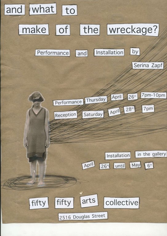 "And What to Make of the Wreckage" is an installation and a performance. Artist Serina Zapf walks, blindfolded, across the room, burning photographs and nailing the charred remains to the wall with red string; bloody footprints trail in her wake. The installation is the product of this process: burnt photos, a web of red string, footprints. This piece raises questions about memories, bodies, stories, and (im)permanence. Normally photos are taken as a way to remember and represent: they stand in for events and act as crutches for stories. Photos are supposed to tell stories of who we are, where we've been, what we've done, or where we're going. So what happens when photos are destroyed as part of a process with no coherent narrative? Can art trace out the destruction of stories, rather than telling them? What emerges through this act of destruction? If the artist is blindfolded and bound to a process determined before the performance begins, then who (or what) produces the installation?
