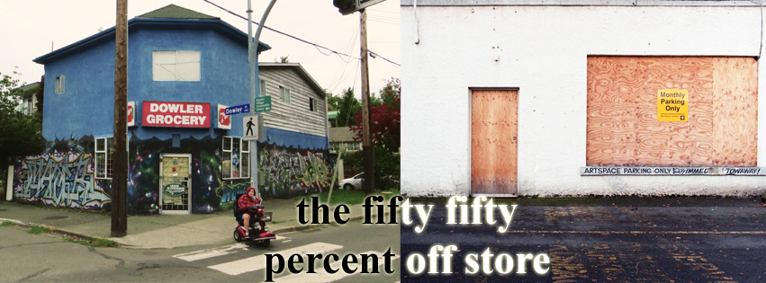 The fifty fifty percent off store is meant to be playful, but at the same time, it seeks to hold a troublesome mirror up to “Victoria”. The object is to record and question the massive physical and mental dispossession currently occurring here in “Victoria” as the city enters into a new phase of gentrification.